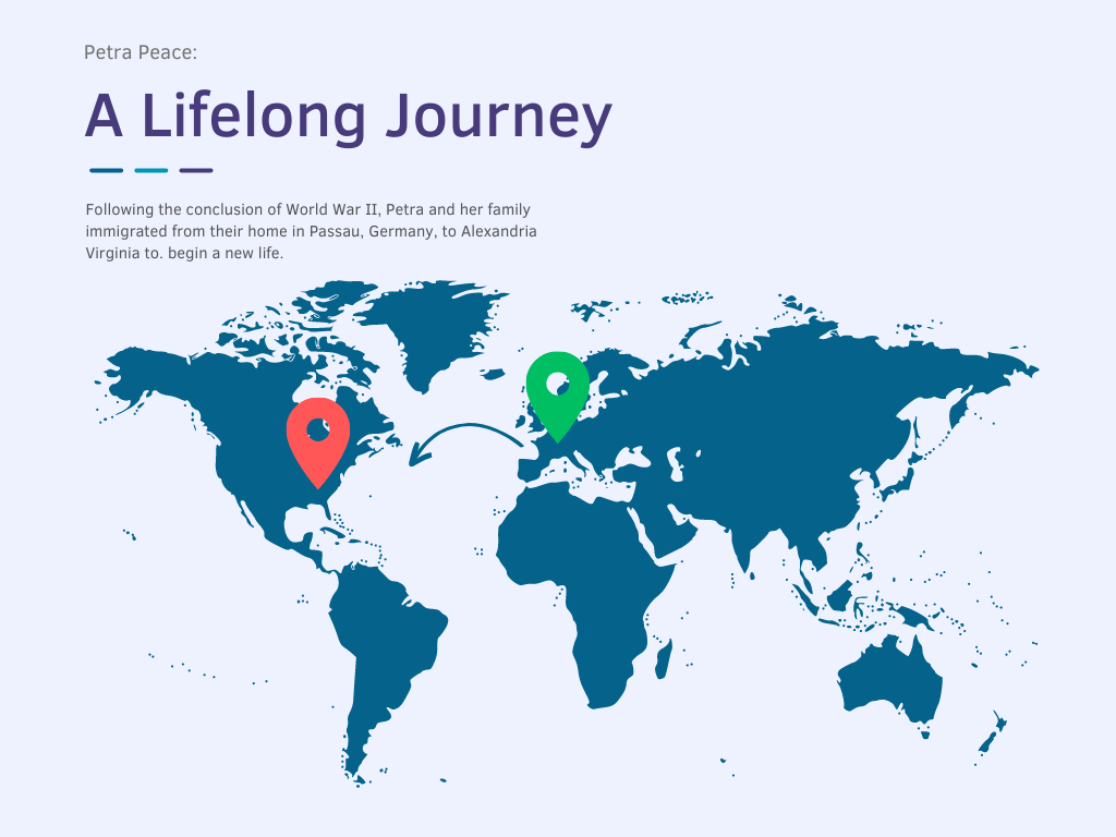 When Petra arrived in the United States, as one of almost 600,000 German Immigrants in the 1950’s, there were many challenges she had to face. The culture was different — she had to speak only in English both at home and in school which led to her completely losing her ability to speak German. She adapted though, and the more normal life became in the U.S., the less connected she felt to her country of birth and the relatives she had left behind.
